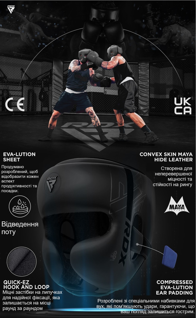 Скористайтеся максимальним захистом, інтегрувавши новітній захисний наголовник RDX у своє тренування. Виготовлений з використанням шкіри Maya Hide, наголовник не тільки зручний, але й відповідає всім вимогам щодо захисту спереду. Polygonal Fusion MOLD закріплюється так, що удар ефективно розсіюється. Стиснений EVA-LUTION SHEET забезпечує повний імунітет від гаків і ударів, а також забезпечує достатню вентиляцію для бою без поту. Застібка Quick-EZ забезпечує надійну фіксацію, одночасно забезпечуючи стабілізацію голови. Сертифіковано UKCA та CE компанією SATRA TECHNOLOGY
